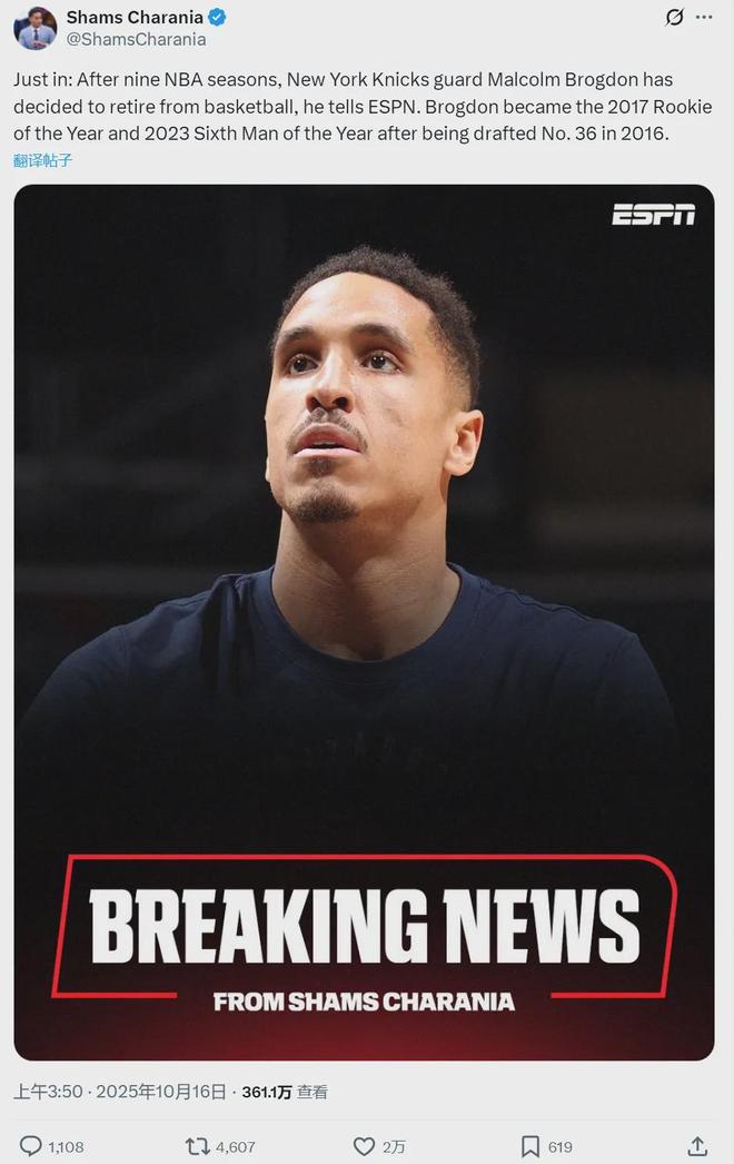 NBA新赛季即将开始,美国篮球名记Shams却给出了一个令人意外的消息:布罗格登决定退役。